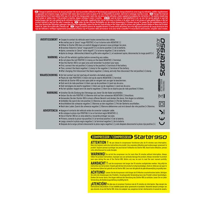 | Caractéristiques complémentaires | BOOSTER DE BATTERIE 12V—15AH-Voltmètre affichant le niveau de charge interne de la batterie-12V 15A avec indicateur de charge à LED-Protection automatique contre les surcharges du circuit-Courant de pointe : 900Ah-Courant de démarrage : 450Ah-Prises DC : 12V-Sortie de l’adaptateur de charge AC : 15V, 500mA-Pinces négative et positive-Cordon d'alimentation AC/DC (inclus)-Recharge 12V sur allume-cigare (câble inclus)-Lumière LED d'urgence et de travail 3,2V/0,5W-Avertisseur sonore de polarité-Compresseur d’air : 18 BAR / 260 PSI-Manomètre de pression-Embouts supplémentaires (ballon, standard) inclus-Temps de charge : 20 heures-Batterie : Plomb-acide étanche, 12V-15Ah-Convient aux moteurs Diesel de moins de 2.0L-Convient aux moteurs Essence de moins de 3.0L |