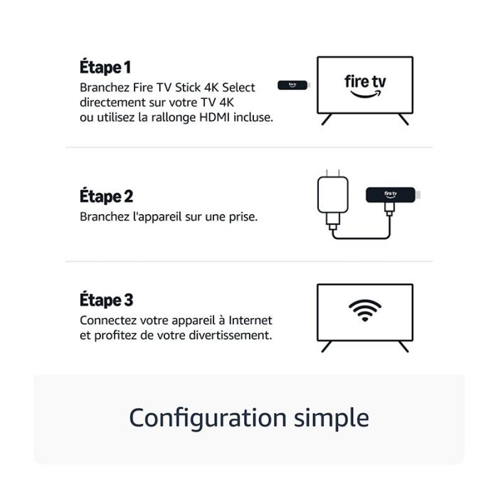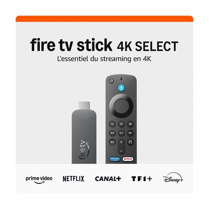 | Inclus dans la boîte | Fire TV Stick 4K Select, télécommande vocale Alexa, câble d'alimentation et adaptateur secteur, rallonge HDMI pour Fire TV Stick 4K Select, 2 piles AAA et guide de démarrage rapide |