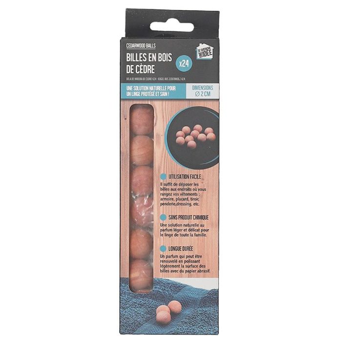 | Caractéristiques complémentaires | Ces billes en bois de cèdre absorbent l'humidité et les odeurs, une méthode naturelle contre les mites et autres insectes ! Facile d'utilisation, déposez les billes dans vos armoires, placards, tiroirs et dressings pour protéger votre linge. Renouvelez leur parfum en polissant légèrement leur surface avec du papier abrasif 24 Billes de diamètre 2cm |