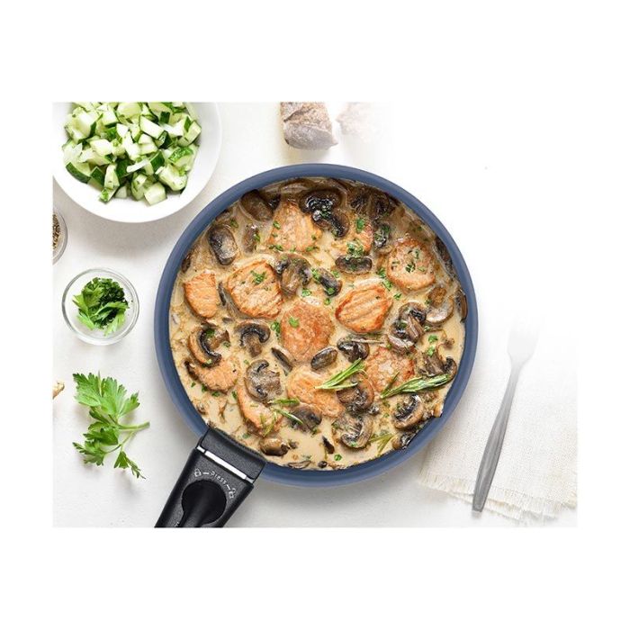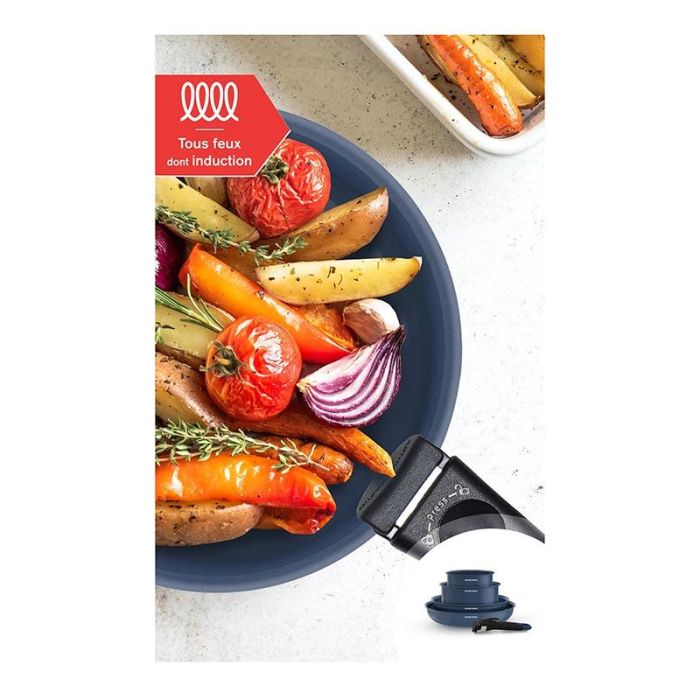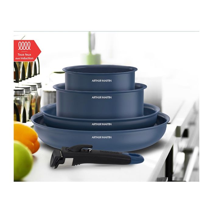 | Caractéristiques complémentaires | Batterie de cuisson 5 pcs 2 poêles 22 et 26 cm 2 casseroles 16 et 18 cm 1 poignée amovible Aluminium 2,5 mm - Revêtement intérieur céramique Tous feux dont induction ATTENTION : Ne pas mettre la poignée au lave vaisselle ni la plonger dans l'eau. |