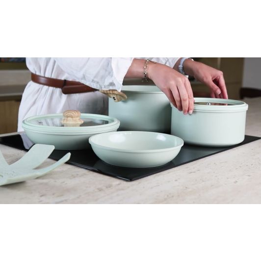 | Caractéristiques complémentaires | Batterie de cuisson 8 pièces composée de : - Poêle 20 et 24 cm - Casserole 20 cm - Faitout 24 cm - Couvercles verre joints silicone 20 et 24 cm - Poignée amovible - Feutrine de protection |