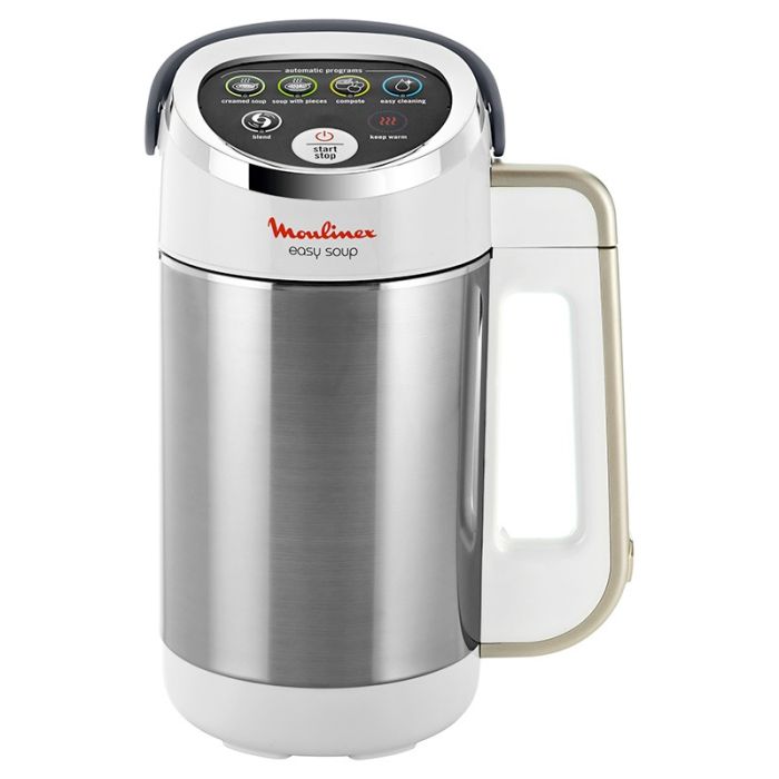 | Informations complémentaires | FACILE : grâce à Easy Soup, préparez de délicieuses soupes, compotes et smoothies faits maison pour 4 personnes (capacité de 1,2 l) GAGNEZ DU TEMPS : 5 programmes automatiques (d'une durée de 4 à 25 minutes) vous feront gagner du temps en cuisine en vous permettant de préparer des soupes onctueuses, des soupes avec morceaux, des compotes et des smoothies INTERFACE INTUITIVE : En deux clics, votre machine à soupe est prête à l'emploi CONFORTABLE : Grâce à son isolation à double paroi, cette machine à soupe garde votre soupe au chaud pendant 40 minutes une fois qu'elle est prête MIXAGE PARFAIT : Les 4 lames mixent vos soupes et préparations à la perfection COMPACT : Grâce à son cordon électrique amovible, cette élégante machine à soupe s'intègre parfaitement dans toutes les cuisines LIVRE DE RECETTES : 30 recettes pour commencer à préparer des soupes d'hiver et d'été, de délicieuses compotes, des smoothies et des desserts |