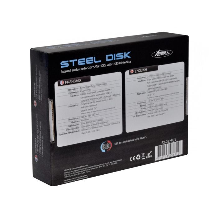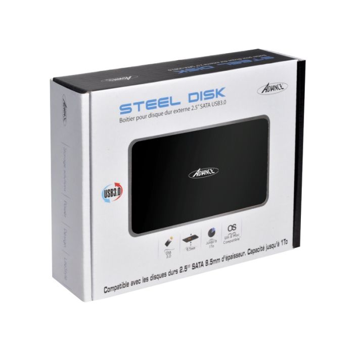 Boitier Disque dur 2,5" USB 3.0 ADVANCE Aluminium Noir Brossé – Plug & Play