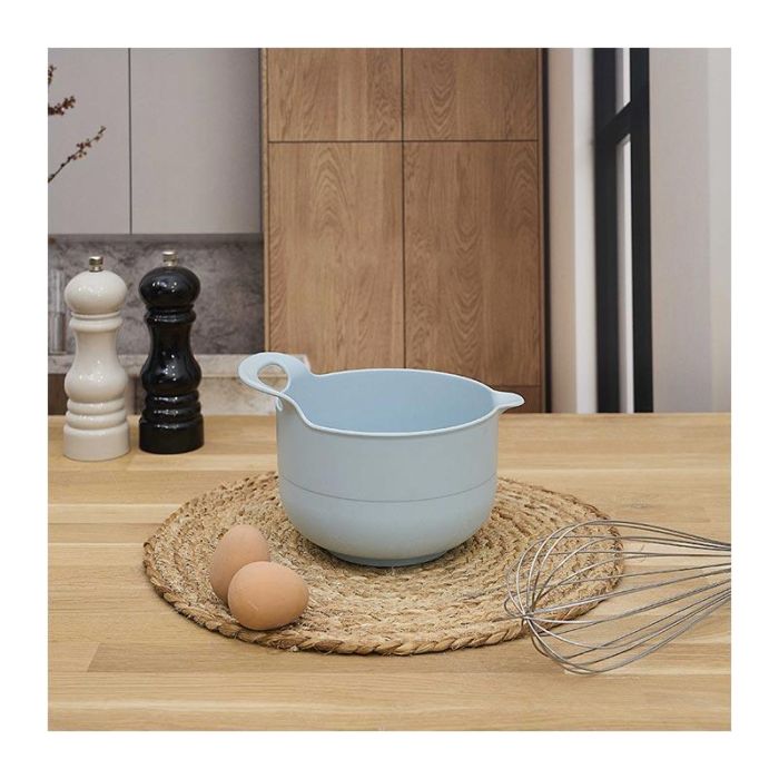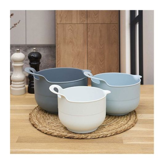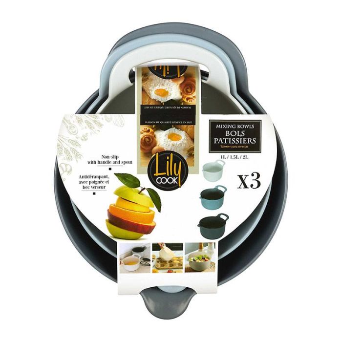 | Caractéristiques complémentaires | Set de 3 bols de préparation empilables, contenances 1L, 1,5L et 2L Base avec cercle antidérapant, poignée et bec verseur Bol 1L, dimensions 18,7x,5x9,5 cm Bol 1,5L, dimensions 21x14,9x9,5 cm Bol 2L, dimensions 24,2x16,Xx12 cm |