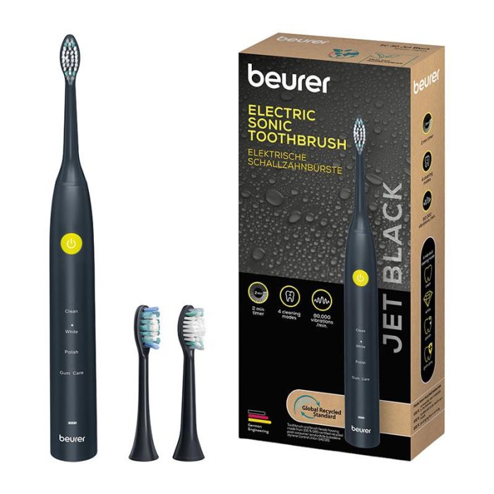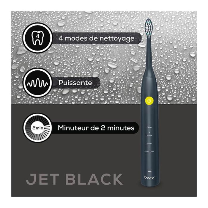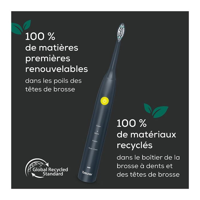 | Caractéristiques complémentaires | BROSSE A DENT ELECTRIQUE SONIQUE BEURER SC30 Technologie sonique puissante pour une élimination complète de la plaque dentaire 4 programmes de nettoyage individuels : Clean, White, Polish, Gum Care 80.000 oscillations/min Minuterie de 2 minutes et minuterie quadrantale intégrées Batterie puissante avec 15 jours d'autonomie Indicateur de charge LED Cadenas de voyage pratique Comprend 2 têtes de brosse (Classic Clean et Premium Whiten) et un câble de chargement USB-C. La brosse à dents et les têtes de brossage sont constitués à 100 % de matériaux recyclés. 100% de matières premières renouvelables dans les poils Têtes de brosse à dents avec poils indicateurs Batterie lithium-ion : 600 mAh, 3,7 V Dimensions du produit (HxØ) : 160 mm (sans tête de brosse) x 28 mm Poids du produit : 125 g (brosse à dents + 2 têtes de brossage + câble de chargement) Garantie de 3 ans |