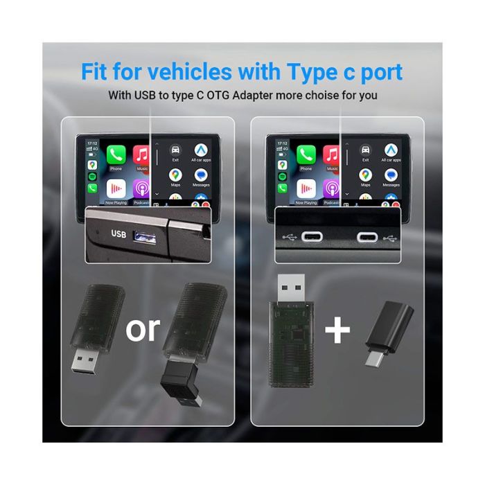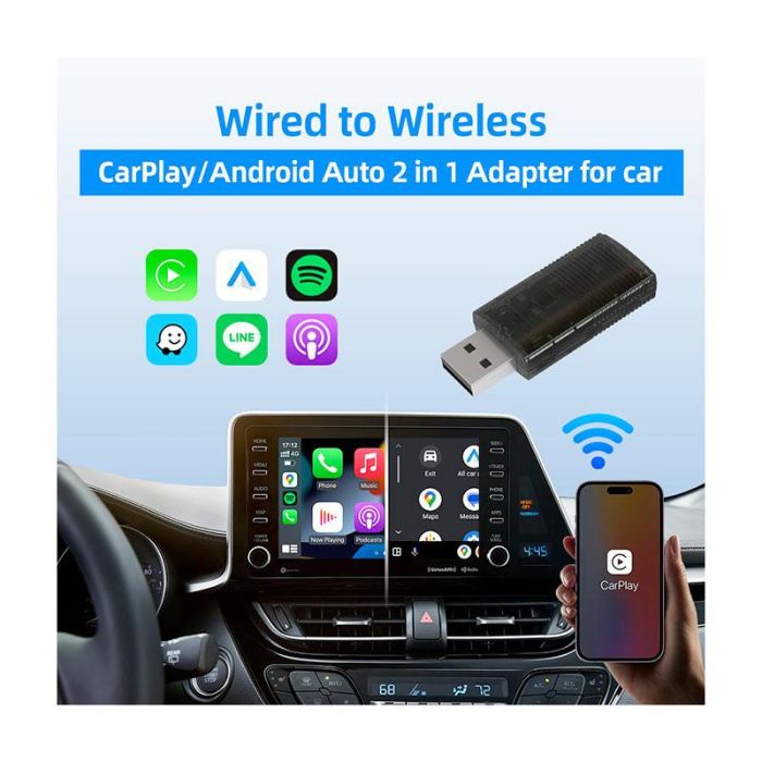 | Descriptif long (Websites) | Convertir Car Play filaire en Car Play sans fil Convertir Android Auto filaire en Android Auto sans fil Adaptateur USB 90° (Type A vers A) Adaptateur USB (type A vers C) Wi-Fi 2,4 et 5 GHz Bluetooth V4.2 |