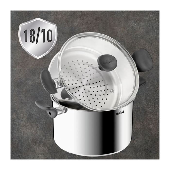 | Caractéristiques complémentaires | Marmite 3 en 1 qui facilite la préparation de repas sains et délicieux ! Le couscoussier Primary combine un faitout et un panier à vapeur en acier inoxydable de première qualité, ainsi qu'un couvercle en verre avec évent à vapeur. Il est idéal pour préparer le couscous, cuire à la vapeur vos poissons, crustacés et légumes et mijoter vos plats. Compatible avec toutes les surfaces de cuisson, y compris induction. Ce faitout haute performance présente un design intelligent avec des repères de mesure faciles à lire, des poignées qui restent froides pour plus de confort et passe au lave-vaisselle pour un nettoyage sans effort ! Diamètre 24 cm - Contenance 9L Qualité inox 18/10 |