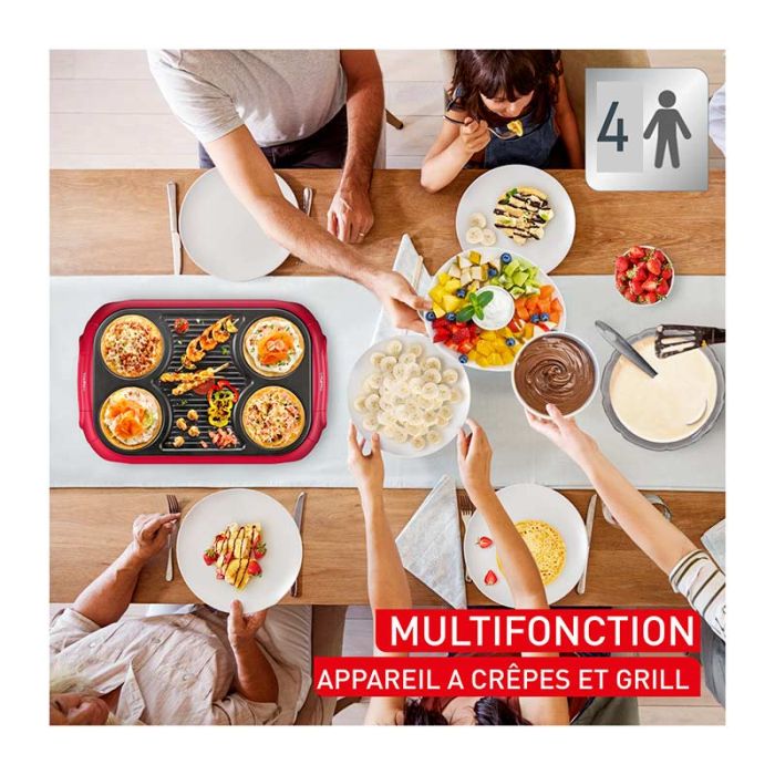 | Caractéristiques complémentaires | Des crêpes et des garnitures grillées pour tout le monde ! Partagez des moments chaleureux avec la Crêpe & Grill Party de Tefal, qui associe une zone de grill centrale et des mini-crêpes sur la même plaque. Grâce à son revêtement antiadhésif robuste et à son indicateur de chaleur pratique, profitez d'une utilisation aisée et obtenez des résultats parfaits chaque fois ! Quelles que soient vos préférences en matière de recettes sucrées ou salées, cet appareil est idéal pour vous régaler ! MULTIFONCTION : appareil à crêpes et grill, jusqu'à 4 crêpes à la fois avec leur garniture grillée, idéal pour partager de délicieux moments en famille et entre amis REVÊTEMENT ANTIADHÉSIF : revêtement antiadhésif sur la plaque pour une durabilité et une résistance accrues RANGEMENT COMPACT : espace de rangement intégré sous l'appareil pour stocker facilement la louche incluse. FABRICATION FRANÇAISE : produit fabriqué en Haute-Savoie selon une expertise et un savoir-faire traditionnels ENGAGEMENT DE RÉPARABILITÉ PENDANT 15 ANS AU JUSTE PRIX : faites réparer votre produit par notre réseau de 6 200 centres de réparation dans le monde pour qu’il dure dans le temps INDICATEUR DE CHALEUR : l'indicateur de chaleur Thermo-Spot devient rouge quand la température idéale de cuisson est atteinte DESIGN COLLECTOR : recettes sucrées ou salées, laissez-vous inspirer par ce modèle au design édition limitée "feux d'artifice" |