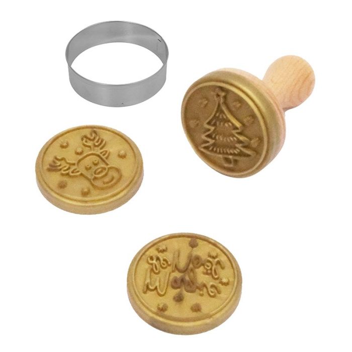 | Descriptif long (Websites) | Tampon biscuits Manche bois, tampsion silicone 3 empreintes différentes : cerf, sapin, Joyeux Noël |
