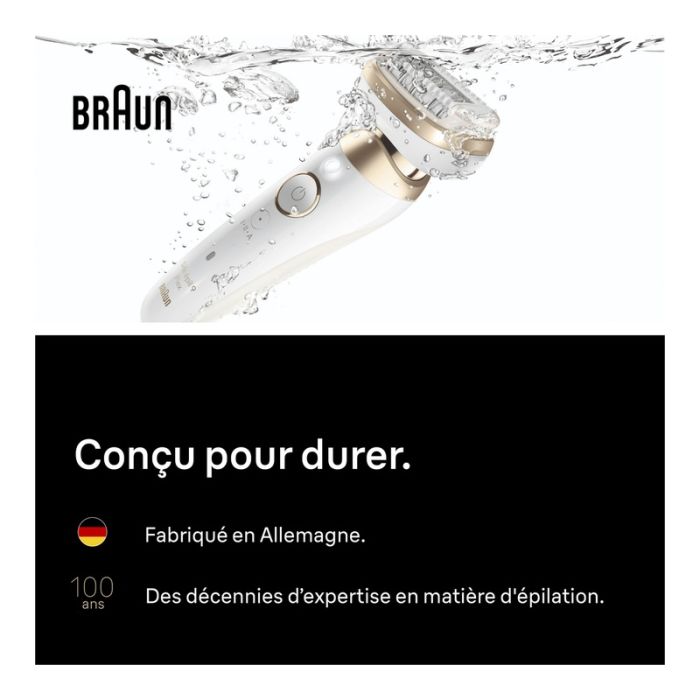 | Caractéristiques complémentaires | ÉPILATEUR BRAUN SILK-EPIL 9 FLEX Résultats Longue Durée : Conçu pour offrir jusqu'à un mois de peau douce en une seule séance à domicile. Technologie Micro-Grip : Équipé de 40 pincettes capables d'attraper les poils extrêmement courts (0,5 mm) que la cire ne peut pas retirer. Tête Large 360° : Sa tête pivotante 3D suit les courbes du corps pour une épilation efficace et rapide, même sur les zones difficiles. Usage Wet & Dry : Totalement étanche, il permet une utilisation sous la douche ou dans le bain pour une expérience plus douce et moins douloureuse. Contrôle Smart Touch : Adapte la puissance de l'appareil à la pression exercée sur la peau, passant automatiquement du mode puissant au mode doux. Éclairage Smart Light : Intègre un voyant lumineux intelligent qui révèle les poils les plus fins pour une précision maximale. Polyvalence 3-en-1 : Le coffret comprend une tête de rasage et un sabot tondeuse pour raser et tondre les zones sensibles. Autonomie et Liberté : Offre jusqu'à 50 minutes d'utilisation sans fil après une charge complète. Entretien et Accessoires : Livré avec une brosse de nettoyage, un accessoire de précision, une pochette de rangement et un chargeur intelligent Smart Plug. Caractéristiques Physiques : Appareil léger (179 g) fonctionnant sur une tension universelle de 100-240V. |