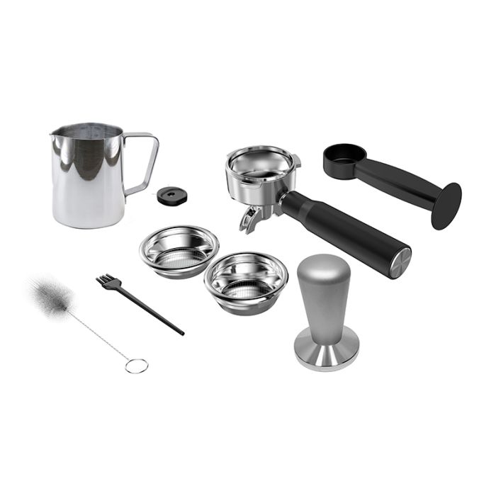 La machine expresso avec percolateur et moulin à café Valberg PUMPGRINDER M1 est livrée avec un Porte-filtre , un Filtre 1 tasse, un Filtre 2 tasses , un Pilon en Inox avec poignée en ABS, une Brosse pour le canal de mouture, une Brosse de nettoyage pour le moulin à café et un Pichet à lait en Inox.