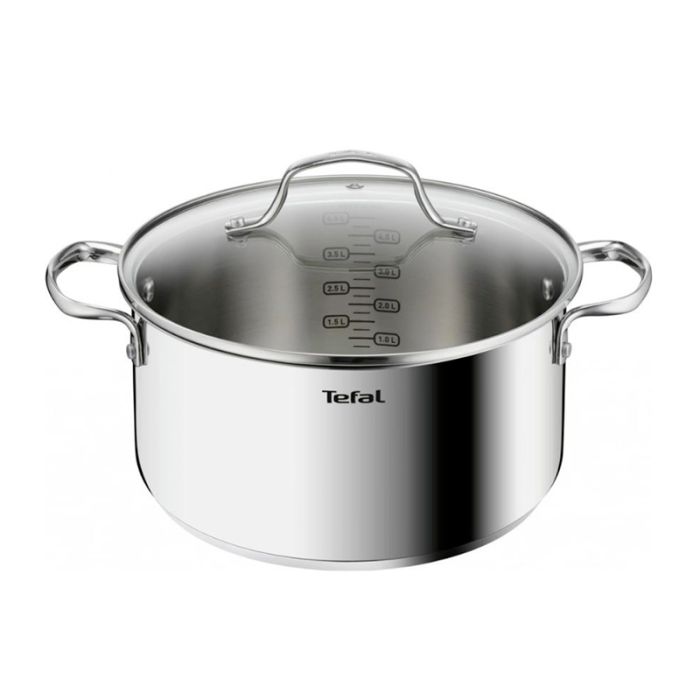 | Caractéristiques complémentaires | Faitout avec couvercle verre, diamètre 24 cm de la gamme Tefal Infinite Contenance 5,4 L Acier inoxydable 18/10 Extérieur inox poli Fond capsule épais et large qui garantit une répartition de la chaleur homogène. Poignées rivetées et couvercle en verre. Graduations intérieures jusqu'à 5 litres Utilisation sur tous types de feux. Peut aller au four jusqu'à 250°C sans le couvercle Attention, lors de la cuisson, les poignées peuvent devenir chaudes. A manipuler avec des maniques |