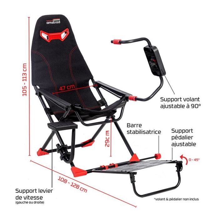 | Descriptif complémentaire | ° Support pour volant avec rotation jusqu'à 90° ° Base pour pédalier avec inclinaison réglable ° Support pour levier de vitesse gauche ou droite ° Accoudoir réglable à 3 niveaux ° Hauteur du support volant: 47cm ° Barre stabilisatrice latérale |
