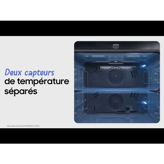 Composée de 3 ou 4 vitres, la porte froide est une porte dont la température ne dépasse pas 65°C.Une sécurité pour les foyers avec enfants.Ce four SAMSUNG possède 20 modes de cuisson, ainsi que 2 lèchefrites, 1 sonde de température et 1 grille.