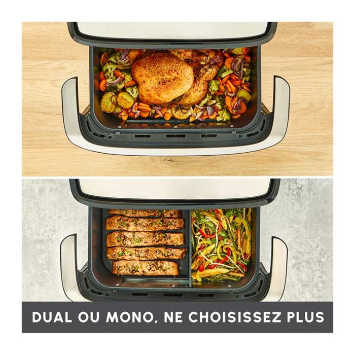 | Caractéristiques complémentaires | Avec Easy Fry Dual Flex, utilisez le séparateur amovible et passez de une seule méga zone (9 L) à 2 zones de cuisson (5,5 L + 3,5 L) Utilisez la Méga Zone pour cuire des pièces volumineuses et de grandes quantités jusqu'à 8 personnes. Vous pouvez choisir de cuisiner avec deux zones distinctes pour cuire divers ingrédients avec des temps de cuisson et des températures différents. |