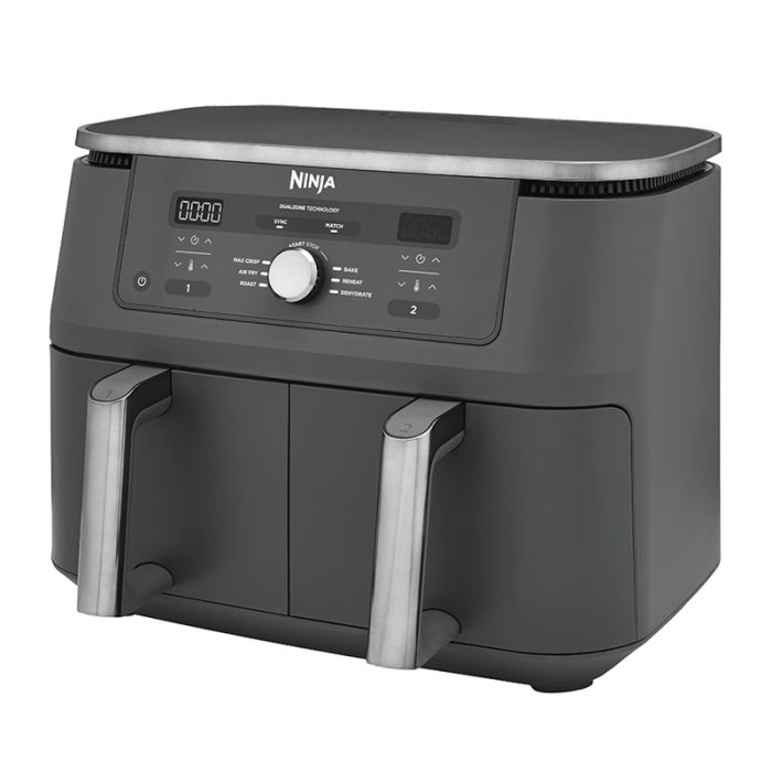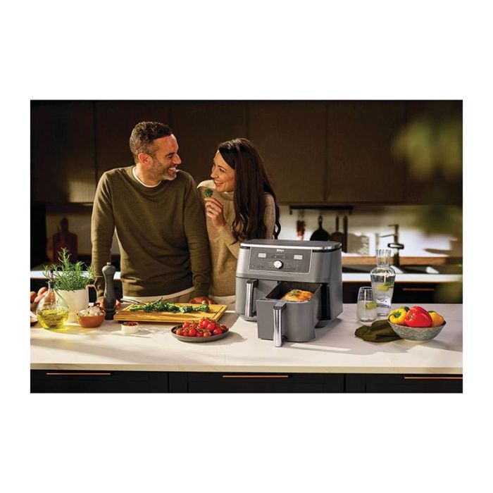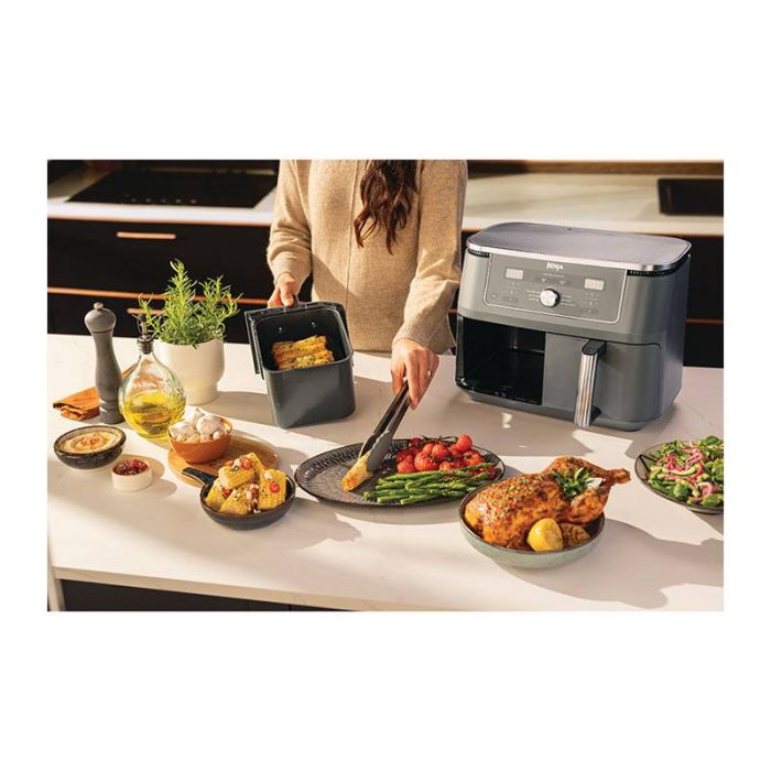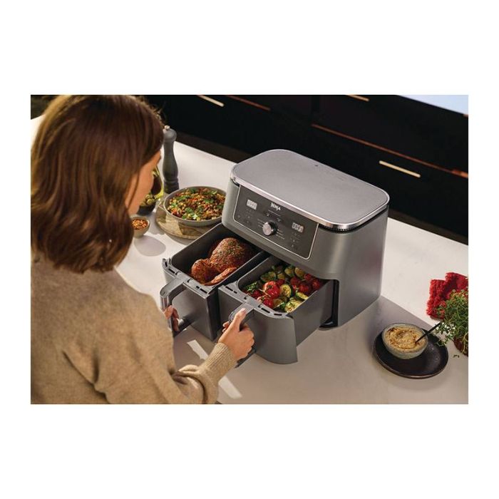 | Caractéristiques complémentaires | Description Craquez sans culpabiliser avec la friteuse sans huile DUAL ZONE de Ninja Foodi. Préparez 2 types d’aliments avec 2 temps de cuisson différents dans les 2 tiroirs de cuissons indépendants, ou utilisez simplement un seul des tiroirs. Repas complet, sucré-salé, snack végétariens ou pas, faîtes-vous plaisir avec des recettes variées, avec jusqu’à 75% de matières grasses en moins. . CUISINE SAINE ET GOURMANDE: technologie de cuisson permettant de réaliser des fritures croustillantes avec jusqu’à 75% de MG en moins . CUISSON RAPIDE: Jusqu’à 65% d’économie d’énergie par rapport à un four. . SYNCHRONISEZ LES FINS DE CUISSON : Cuisinez facilement une ou 2 recettes et utilisez les fonctions SYNC ou MATCH pour que la cuisson des aliments dans les 2 tiroirs se termine en même temps. . POLYVALENT: 6 Menus de cuisson dont Max Crisp (pour décongeler les aliments rapidement), Frire sans huile (Air Fry), Réchauffer (en préservant le croustillant et les saveurs ), rôtir, cuisson four, et déshydrater (pour des snacks sains et 100% naturels) . Temps et températures de cuisson ajustables ( de 40°C jusqu’à 240°) . USAGE PRATIQUE : Minuteur LCD avec arrêt automatique et décompte du temps de cuisson. . FACILE À NETTOYER: Accessoires amovibles, compatibles lave-vaisselle . Capacité familiale : 2x 4,75L, jusqu’à 2kg de frites ou 2 kg d’ailes de poulet. |