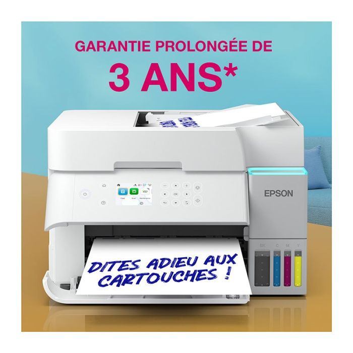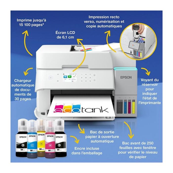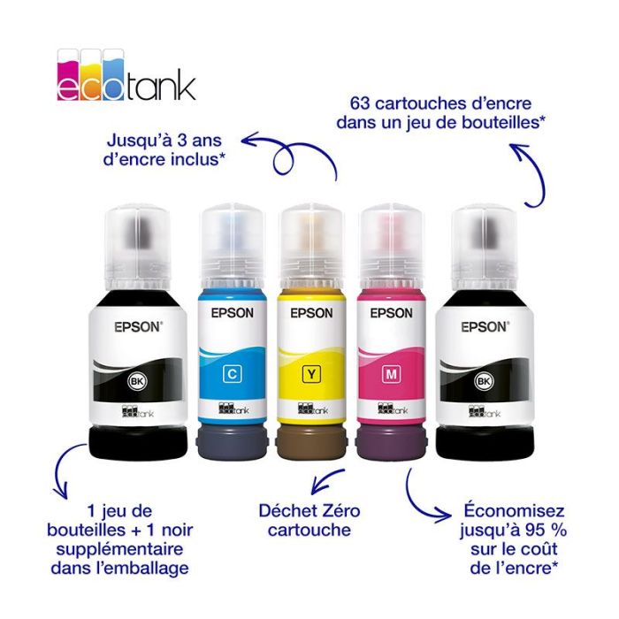 | Descriptif long (Websites) | CARACTÉRISTIQUES PRINCIPALES ► Économisez jusqu’à 95 % sur le coût de l’encre* Grâce aux réservoirs d’encre rechargeables EcoTank, réduisez drastiquement vos dépenses d’impression. ► Une impression simplifiée et ultra-économique L’équivalent de jusqu’à 63 cartouches inclus dans un seul jeu de bouteilles* Jusqu’à 3 ans d’encre inclus dans la boîte* Imprimez jusqu’à 15 100 pages en noir et blanc et *5 500 pages en couleur ► Performances complètes tout-en-un Impression, copie et numérisation recto verso de haute qualité Chargeur automatique de documents au format A4 Connexion Wi-Fi fiable pour imprimer où que vous soyez Application Epson Smart Panel : configurez, surveillez et imprimez directement depuis votre smartphone* ► Utilisation simple et sans tracas Réservoir d’encre pratique à recharger avec des bouteilles Système anti-erreur : les bouteilles EcoTank sont équipées de détrompeurs pour un rechargement sans difficulté |