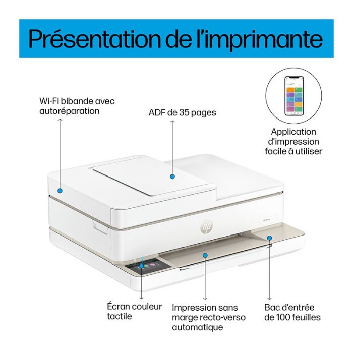 | Caractéristiques complémentaires | ► Imprimante tout-en-un avec impression, copie et numérisation ► Vitesse jusqu'à 10 pages/min en noir et 7 pages/min en couleur ► Résolution d'impression jusqu'à 4800 x 1200 dpi ► Connexion USB et Wi-Fi avec impression mobile ► Bac d'alimentation de 100 feuilles ► Impression recto-verso automatique ► Impression photo sans bordures ► Compatible avec HP+ pour des fonctionnalités avancées ► Sécurité dynamique limitant l’usage aux cartouches HP |