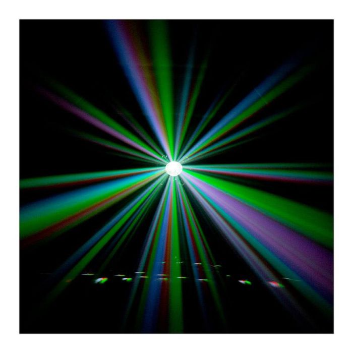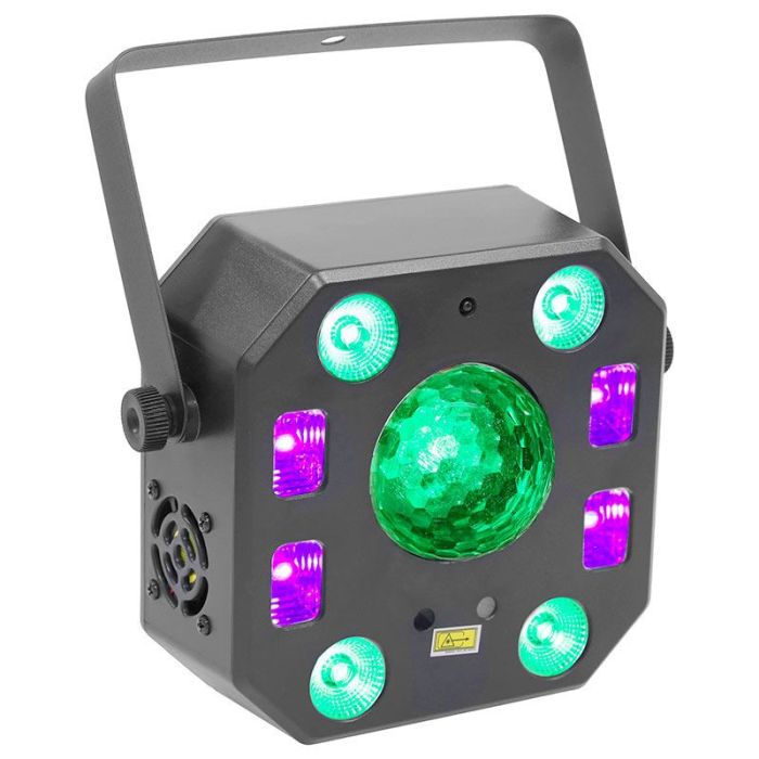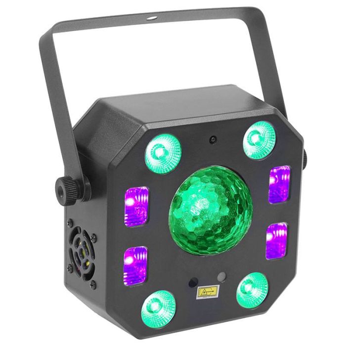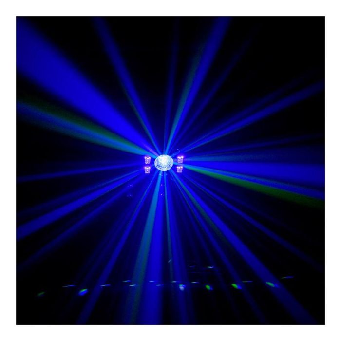 Descriptif complémentaire | Il regroupe en un seul appareil : un projecteur Wash LED RGBW, un LASER, un Stroboscope avec LED blanche et UV, et i,e Crystal Ball avec une angle de projection de 120 degrès. |