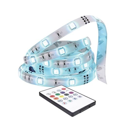 | Caractéristiques complémentaires | Créez une ambiance lumineuse sous des meubles, derrière votre TV ou à d’autres endroits dans votre maison. Installation facile : les rubans LED sont flexibles et adhésifs, vous pouvez également les couper selon la taille souhaitée. - Ruban de 3 mètres comprenant 90 LED SMD 5050 (30 LED par mètre). - Adhésif de qualité 3M. A appliquer sur une surface lisse, propre et dégraissée. - Couche de protection en résine pour une utilisation sans risques, une protection contre les projections d’eau et un nettoyage facile. - Télécommande permettant de sélectionner les couleurs et l’intensité ainsi que différents modes lumineux. - Adaptateur secteur 12V 1.5A fourni. Consommation 18W - Durée de vie 20.000h. |