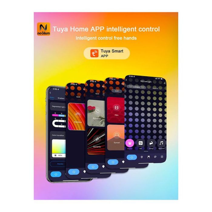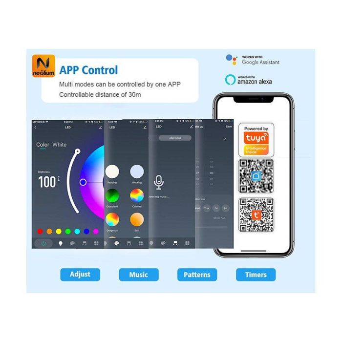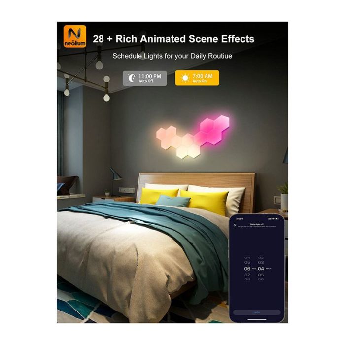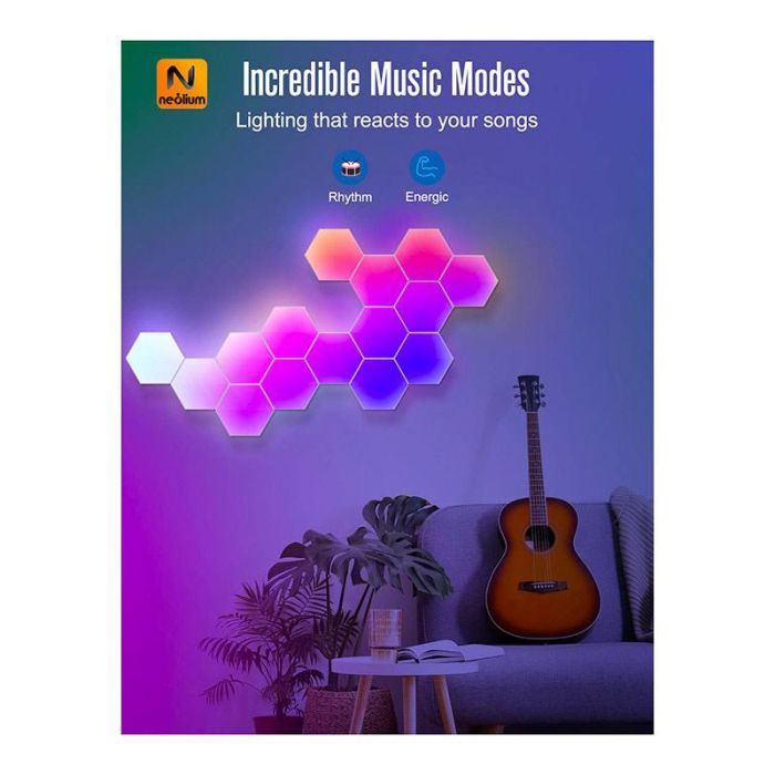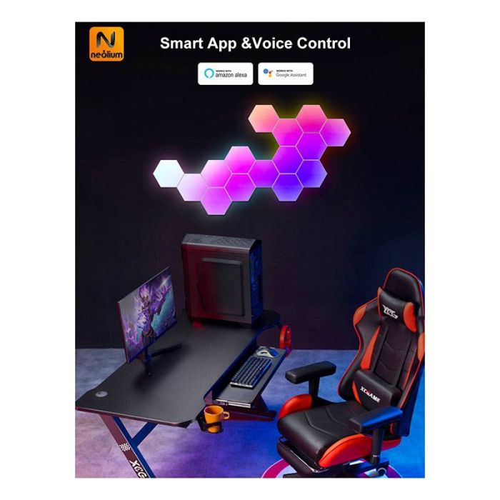 | Caractéristiques complémentaires | Tension d’entrée : DC 5V(Un adaptateur 5V 2A peut alimenter jusqu’à 15 modules)Puissance : 1,5 W par moduleConsommation : 10WCouleur : RGBICMéthode de contrôle : WiFi 2.4GHz (802.11 b/g/n), contrôle local ou à distanceBande de fréquences : 2,412 - 2,484 GHzCompatibilité : iOS & AndroidPartage multi-utilisateurs : Jusqu'à 6 comptesType de contrôle : Application mobile, télécommande infrarouge (IR) incluse, et contrôle manuel par boutonsContrôle par App Tuya / Smart LifeÉtanchéité (IP) : IP20 IntérieurMatériau : Plastique + PCFonctions : Mode musical / Changement de couleurContenu de la boîte: 8 modules LED hexagonaux, 1 Télécommande infrarouge, Connecteurs, 1 Câble USB, Stickers double-face, 1 Boîtier de contrôle |