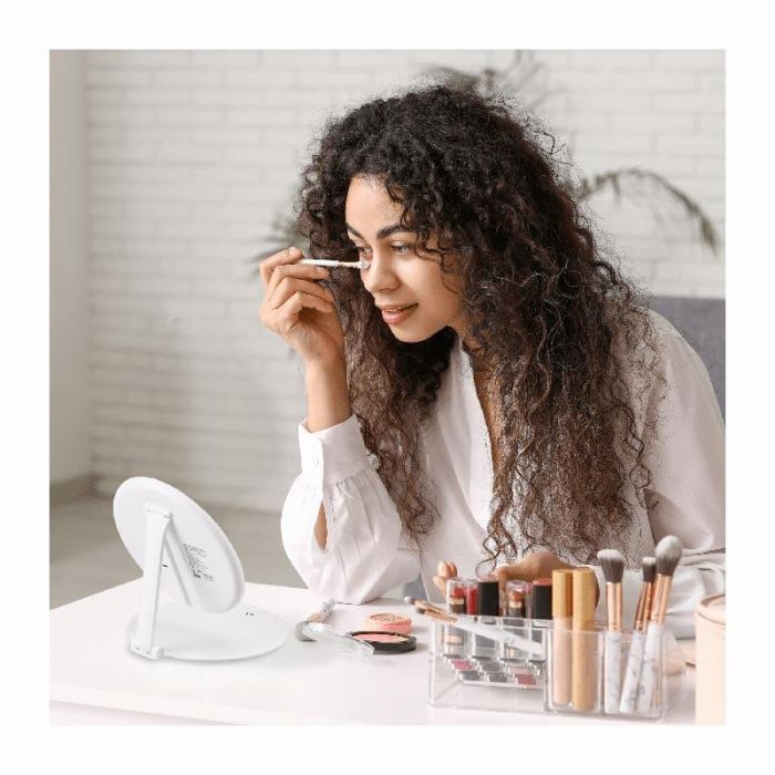 | Caractéristiques complémentaires | MIROIR À LED RECHARGEABLE (SYWB-LM017) Éclairage Personnalisable : Propose 3 températures de lumière (blanc doux, lumière du jour naturelle, blanc neutre) avec une fonction d'intensité réglable (dimmable). Technologie LED : Équipé de 54 ampoules LED haute performance pour une luminosité optimale. Autonomie et Charge : Batterie lithium polymère de 1000 mAh offrant jusqu'à 10 heures d'autonomie par charge. Interface Tactile : Contrôle simple et moderne via un capteur tactile intégré. Conception Nomade : Design fin, léger et compact avec un système de pliage auto-protecteur pour éviter les rayures lors des voyages. Sécurité Énergétique : Fonction d'arrêt automatique intégrée après 30 minutes d'utilisation. Dimensions et Poids : Dimensions de 20 cm x 21,3 cm x 1,9 cm pour un poids de 417 grammes. Surface de Miroir : Verre de haute qualité avec un diamètre de 19,5 cm et un grossissement 1x. Connectivité : Rechargeable via un port USB Type-C, avec un câble de 1 mètre inclus dans la boîte. Matériaux : Fabriqué en ABS résistant et verre |