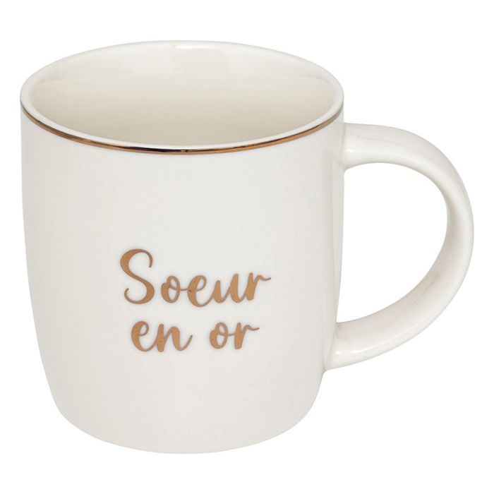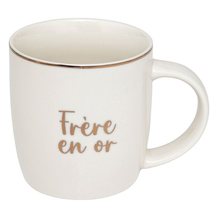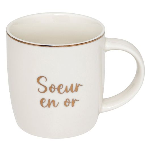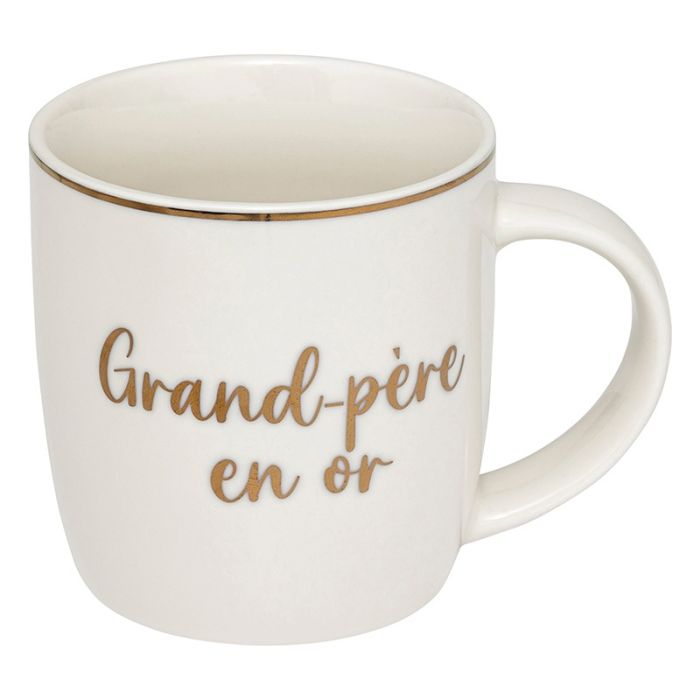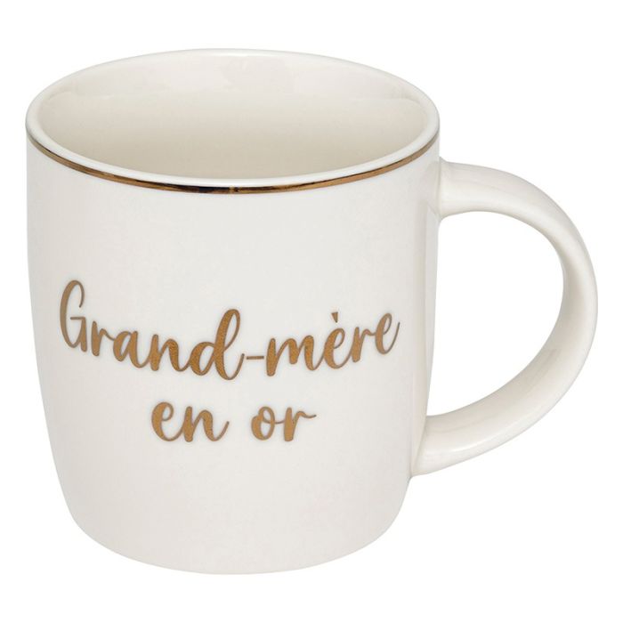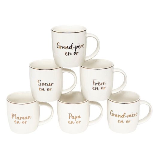 | Caractéristiques complémentaires | Mug "famille" avec inscription dorée Modèle au choix en magasin. Grand-mère, Grand-père, Maman, Papa, Soeur, Frère Conseillé de ne pas passer au lave vaisselle pour conserver l'aspect doré le plus longtemps possible. |