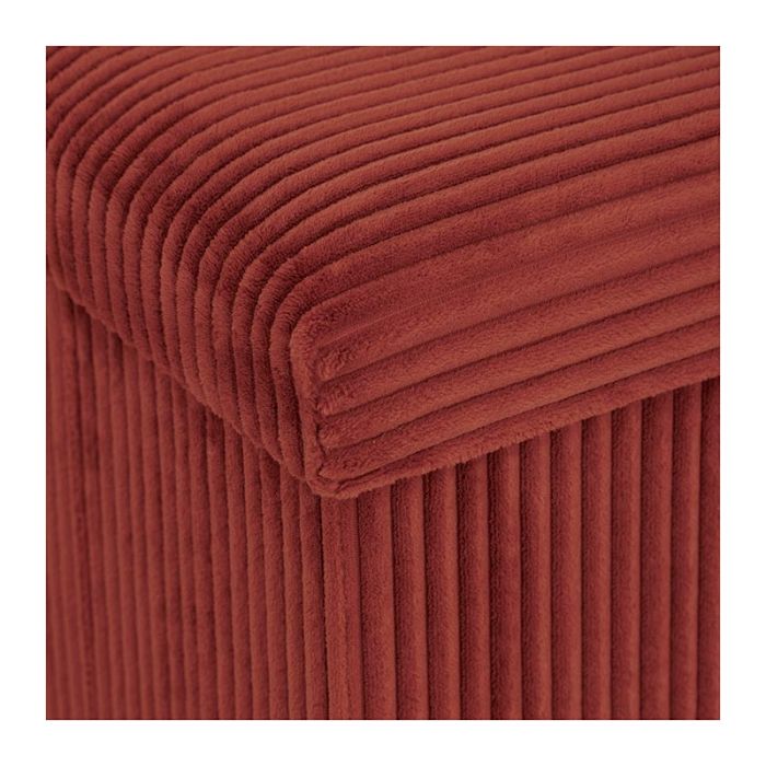 | Caractéristiques complémentaires | Pouf carré pliable Dimensions déplié 38x38 cm Velours côtelé terracota Malin, ce pouf vous offre à la fois une assise confortable et un espace de rangement discret Poids maxi supporté : 110 kg |