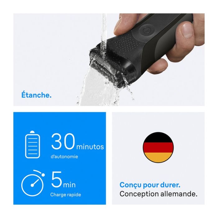Informations complémentaires | RASAGE DE PRES ET IMPECCABLE Deux grilles pour le rasage de près et la protection de la peau S'ADAPTE AUX CONTOURS DU VISAGE Les lames flexibles s'adaptent à vos contours pour un rasage facile et doux dans toutes les zones de votre visage LA PRECISION DANS CHAQUE DETAIL La tête de rasage fine pour un rasage facile même dans les zones difficiles à atteindre comme sous le nez LAVABLE Rincez en toute sécurité votre rasoir Series 3 sous l'eau courante pour un nettoyage facile BATTERIE NiMH LONGUE DUREE Une charge complète permet jusqu'à 30 minutes d'utilisation. Une charge rapide de 5 minutes suffit pour un rasage |