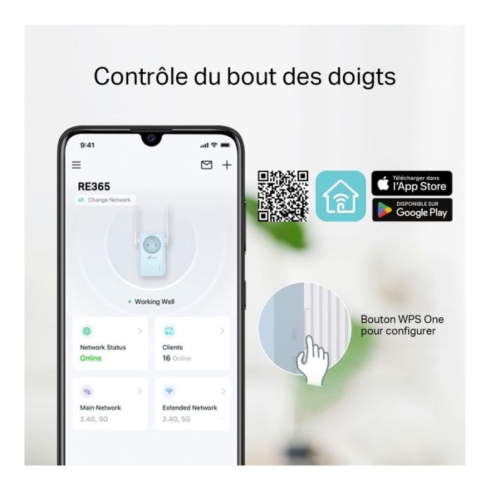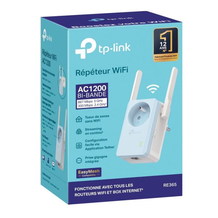 | Caractéristiques complémentaires | Gardez toute votre maison connectée grâce à une forte extension WiFi à une vitesse combinée allant jusqu'à 1,2 Gbit/s La prise de courant intégrée garantit qu'aucune prise de courant n'est gaspillée Le signal lumineux intelligent aide à trouver le meilleur emplacement pour une couverture Wi-Fi optimale en affichant la force du signal Fonctionne avec n'importe quel routeur Wi-Fi ou point d'accès sans fil Une solution d'extension WiFi adaptée aux familles Fatigué des zones sans WiFi dans votre maison ? Le répéteur WiFi RE365 se connecte sans fil à votre routeur WiFi ou Box Internet, renforçant et étendant son signal jusqu'à votre maison. Avec des vitesses allant jusqu'à 300 Mbps sur 2,4 GHz et 867 Mbps sur 5 GHz, remplacez les zones sans réseau par un WiFi puissant et rapide dans chaque pièce. Indicateur de signal intelligent Le voyant intelligent vous aide à trouver le bon endroit pour la meilleure extension de portée, et une interface Web intuitive vous aide à la configurer en une minute seulement. Application riche en fonctionnalités pour un contrôle entre vos mains Téléchargez notre nouvelle application Tether pour gérer votre réseau depuis n'importe quel smartphone Android ou iOS afin de contrôler l'alimentation, l'accès et même l'éclairage LED. Si nécessaire, définissez un nom de réseau et un mot de passe différents Bouton WPS pour une configuation simple |