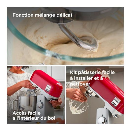 | Caractéristiques complémentaires | Une touche de design dans votre cuisine Le robot kMix Collection Rouge est à la fois design, robuste et performant. Pour un plus grand confort d'utilisation, les commandes sont toutes situées du même côté. Inutile de bouger votre robot sur le plan de travail lorsque vous voulez l'utiliser ! Et maintenant il est encore plus puissant ! Un véritable robot pâtissier Avec son bol en acier inoxydable de 5 litres, son moteur de 1000W, son mouvement planétaire et son kit pâtisserie, le robot pâtissier multifonction kMix est capable de travailler les pâtes même les plus lourdes. La fonction mélange délicat vous permet également de travailler les préparations les plus délicates sans les abîmer. Un véritable robot de cuisine De nombreux accessoires sont adaptables sur le robot kMix afin de vous permettre de laisser libre court à votre imagination : râpe, hachoir, appareil à pâtes fraîches... Efficace et sûr Le contrôle électronique de la vitesse vous garantit une vitesse régulière et constante pour des préparations réussies à la perfection. Pour une sécurité maximum, le robot kMix s'arrête de fonctionner dès que la tête du robot est relevée. Enfin, les robots kMix sont entièrement réalisés en métal pour une durée de vie plus longue. |