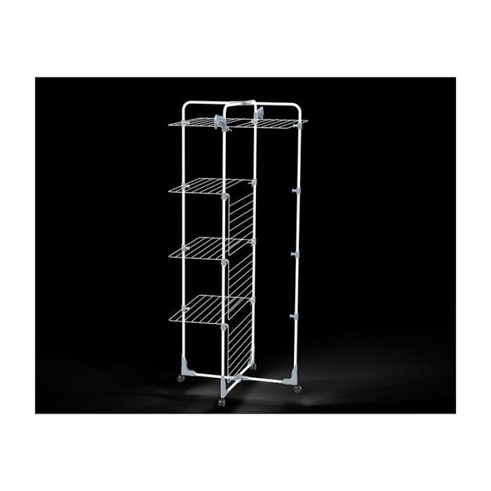 | Caractéristiques complémentaires | Séchoir tour grande capacité 4 niveaux Utilisable en demi ouverture pour étendre des petites lessives 4 roulettes multi directionnelles pour un déplacement facile 2 supports cintres extérieurs Dimensions du produit en utilisation : 64 x 64 x H153 (sans les porte cintres) Dimensions du produit fermé : 5 x 64 x H153 |