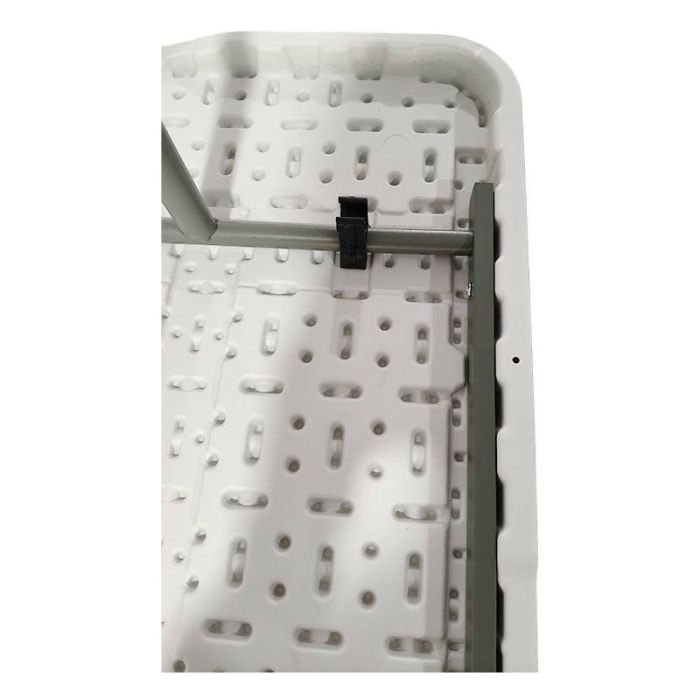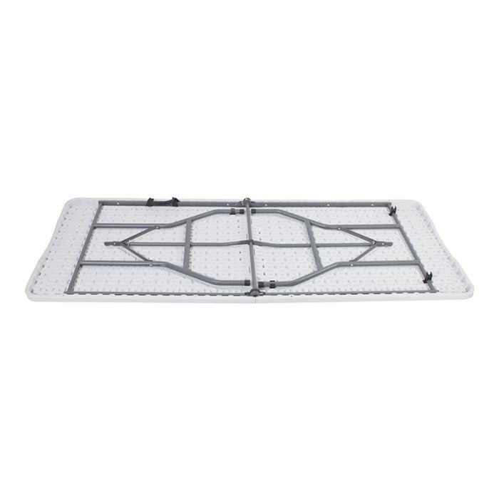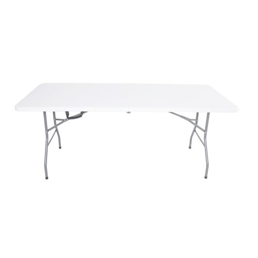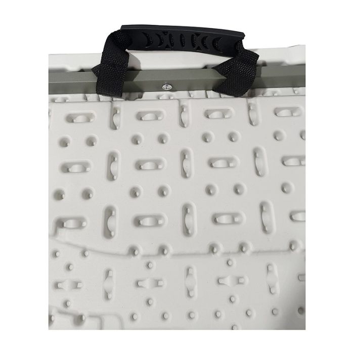 | Caractéristiques complémentaires | Table pliante portable 180 cm Matériaux : Plateau en PEHD (plastique haute densité) épaisseur 3,5 cm + Structure en acier Structure : Pieds ø 22 x 1,0 mm + revêtement en poudre Couleur : Plateau blanc + Structure gris standard Idéale pour les repas en extérieur (facilement transportable) ainsi qu'en intérieur en appoint Poids de la table 9,5 kg Dimensions produit déplié : 180 x 70 x 74 cm Dimensions produit replié : 92 x 71 x 7,5 cm |