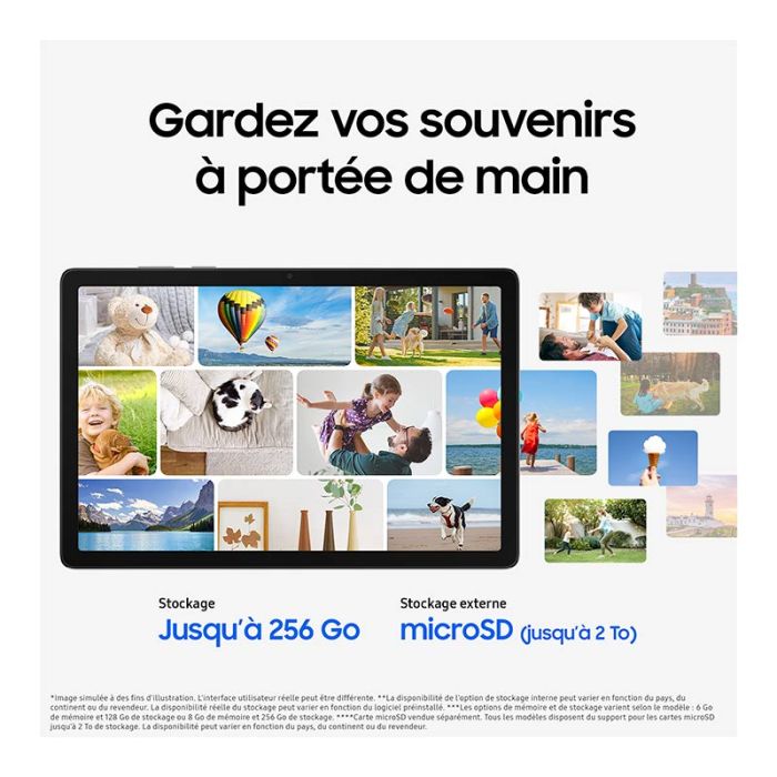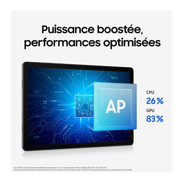 | Descriptif long (Websites) | Retrouver tous vos essentiels du quotidien, sur tablette. Voilà la promesse de la nouvelle Samsung Galaxy Tab A11+. Associé à des haut-parleurs compatibles Dolby Atmos, son écran fluide (taux de rafraîchissement de 90 Hz) transforme chaque film en une expérience immersive. Son stockage de 128 Go, extensible jusqu'à 2 To via microSD, vous permet de stocker tous vos souvenirs dans un seul appareil. Et si vos proches vous manquent, vous pouvez toujours leur rendre visite grâce à sa caméra frontale de 5 MP. |