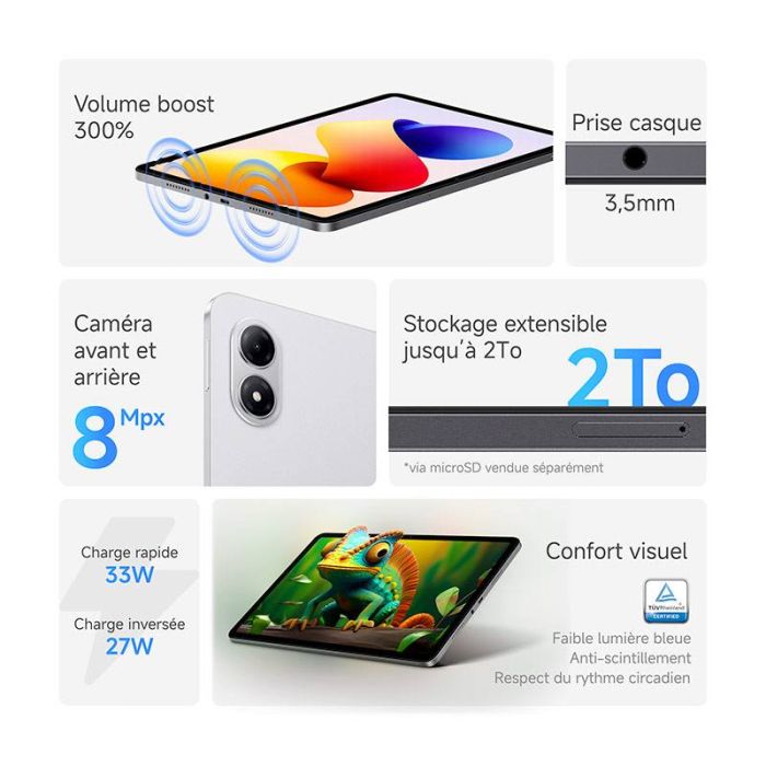 | Informations complémentaires | Écran & Design • Écran 2.5K, 120Hz de 12,1’’ • Résolution : 2560x1600, 249ppp • Rapport d’affichage : 16:10 • Taux de rafraîchissement jusqu’à 120 Hz AdaptivSync • Luminosité : 500 nits (typ), 600 nits (HBM) • DC Dimming • Rapport de contraste : 1500:1 • Colorimétrie : 10-bit, 68,7 milliards de couleurs • Dolby Vision • Certifications TÜV Rheinland faible lumière bleue (solution matérielle), anti-scintillement • Protection Corning Gorilla Glass 3 à l’avant • Résistance eau et poussière IP53 Audio • 4 haut-parleurs stéréo • Volume boost 300% • 2 microphones • Dolby Atmos • Audio Hi-Res • Prise jack 3,5m Logiciel • Xiaomi HyperOS, basé sur Android 15 |